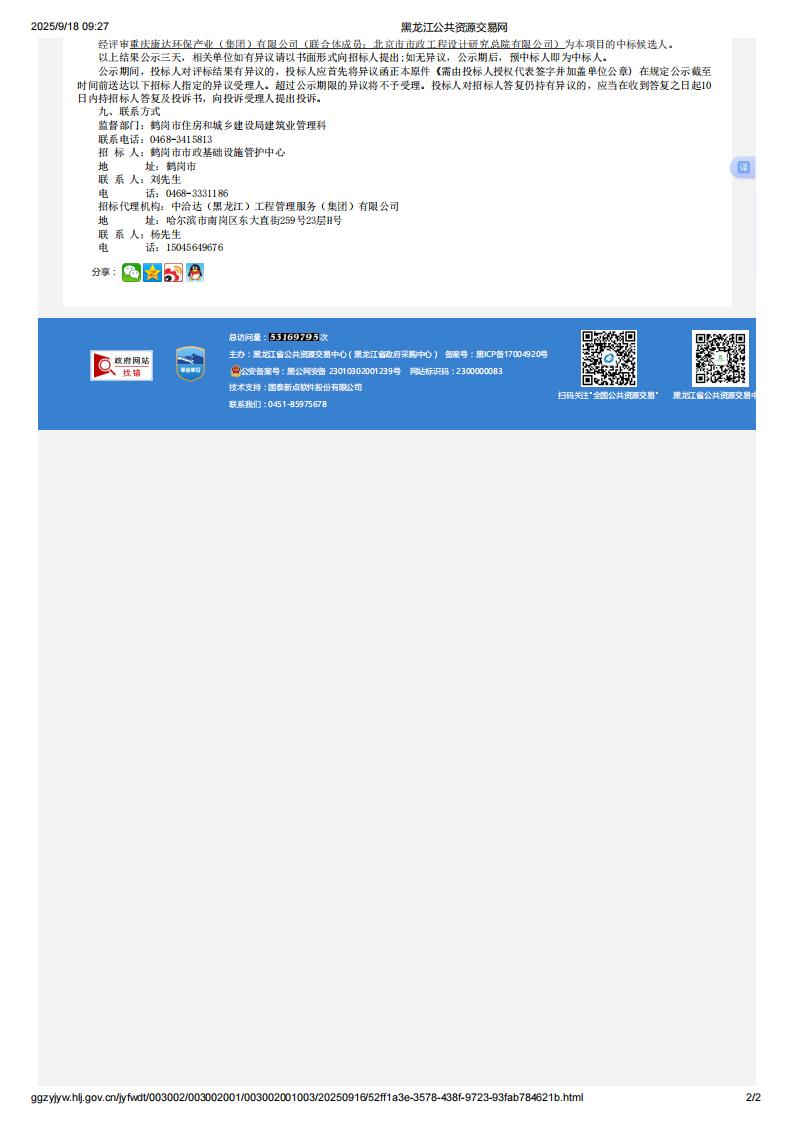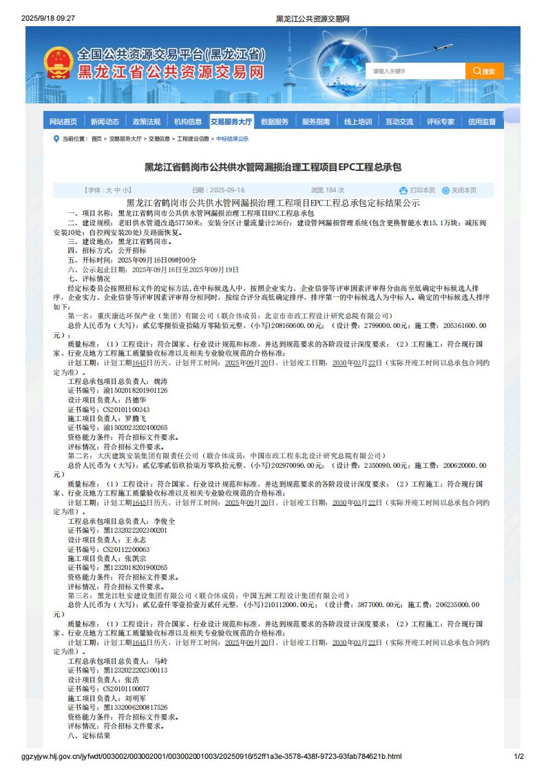 黑龙江省鹤岗市公共供水管网漏损治理工程项目EPC工程总承包中标结果公示